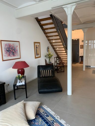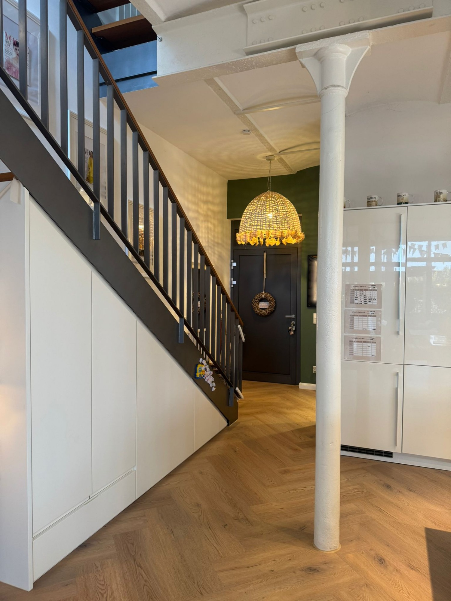 Den Hauptunterschied macht der Boden: Warmes Parkett im Fischgratmuster verlegt, verleiht dem großen Raum einen Rahmen und Wärme - die individuellen Schränke unter der Treppe bieten praktischen Stauraum und schließen den Raum. Persönliche Accesosires und ausgewählte Möbel runden das Gesamtbild ab- für das perfekte Cosymaisondesign-Feeling.